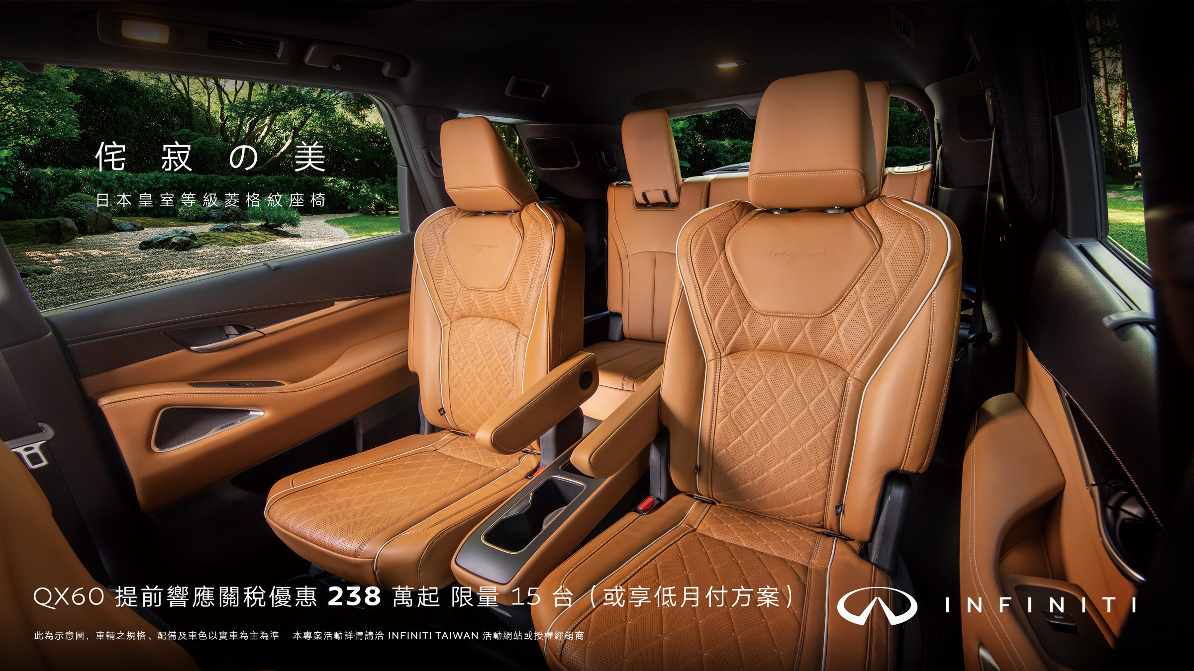 1. 本活動期間為西元2026年3月1日至2026年3月31日止。於活動期間內下訂QX60 2.0t 並完成領牌程序之新車車主(以下稱車主)方具備本專案活動資格,但公司車、大宗批(標)售、租賃車、營業車及政府機關不適用本專案。
