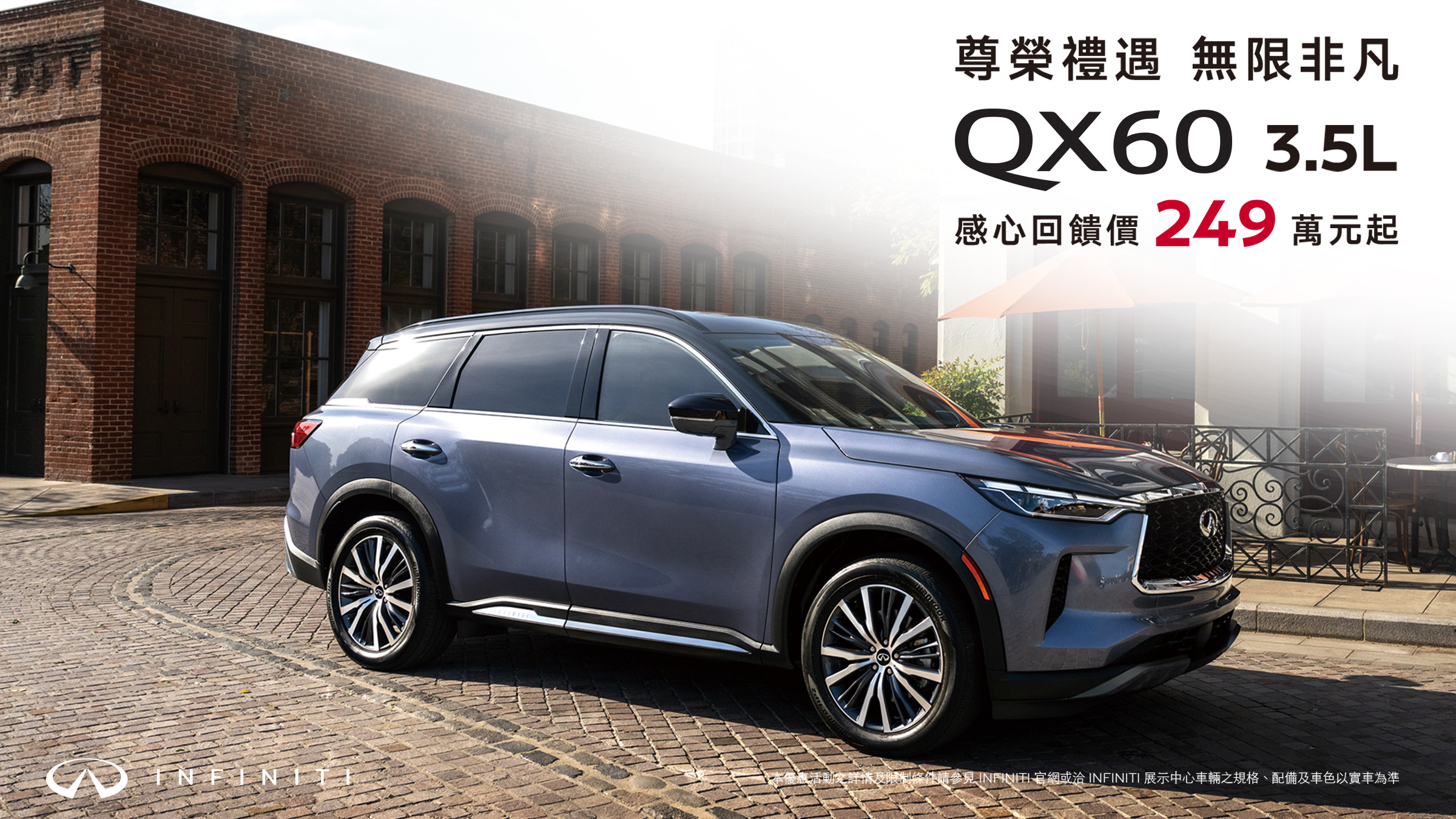 2. 「QX60 3.5L 249萬」係指2024年生產之QX60 3.5L旗艦款原建議售價285萬元,符合本專案優惠資格者,僅限活動期間內下訂並完成領牌程序之新車車主,享有專屬優惠價格249萬元起,售完為止。建議售價會因車輛選配用品、套件不同而有所變更;車輛之規格、配備及車色以實車為準。詳細售價資訊請至 INFINITI TAIWAN 各授權展示中心洽詢。公司法人車、大宗批(標)售車、租賃車、營業車、電動車及跑車車款等不適用於此活動。